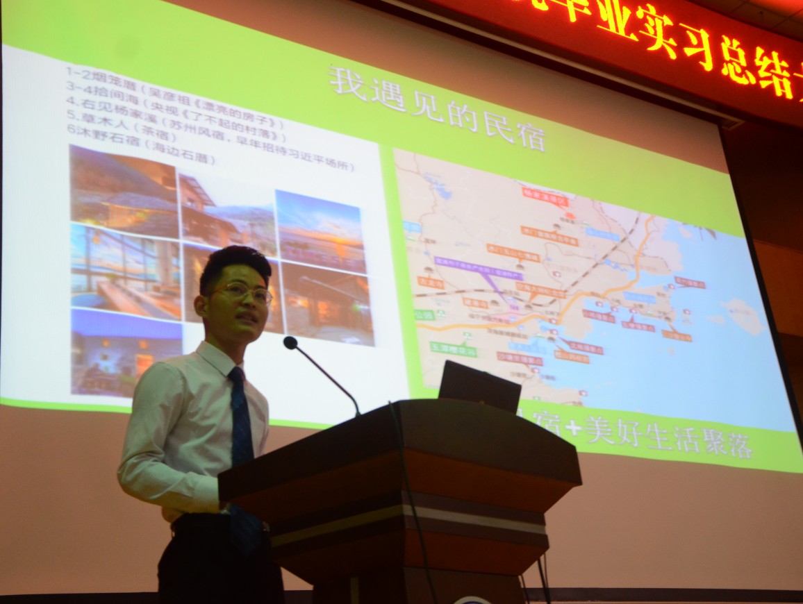旅游管理系主任沈德福和酒店管理系主任詹岚对14级员工为期半年的实习成果做了简单的实习总结汇报。优秀实习生代表旅游管理与服务专业的陈银和酒店管理专业的施艳梅进行了实习经验分享。陈银在杭州西湖茶隐民宿实习,他主要从事线上运营和空间销售工作,不仅加深了对自媒体的理解,同时在与顾客的交流过程中提升了自己的沟通能力与人际交往能力。施艳梅在厦门五缘湾凯悦酒店实习,她主要从事前台接待工作,在实习期间完成了金砖会晤等高规格接待,得到了一定的磨练,也获得了公司的认可。他们表示在今后的成长中将虚心向前辈请教交流,努力提升自己的综合能力,鼓励学弟学妹们树立生活目标,合理规划自己的人生。