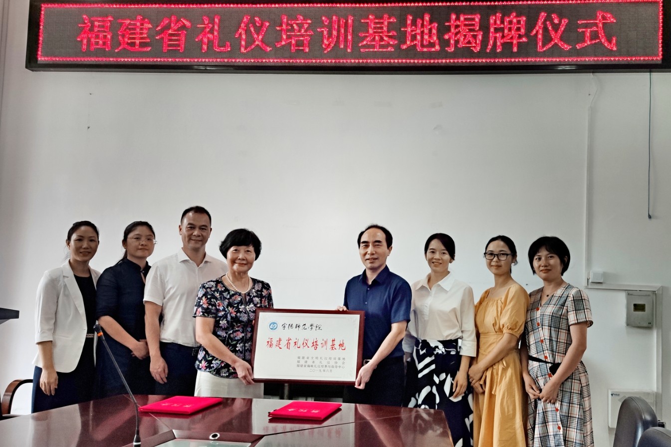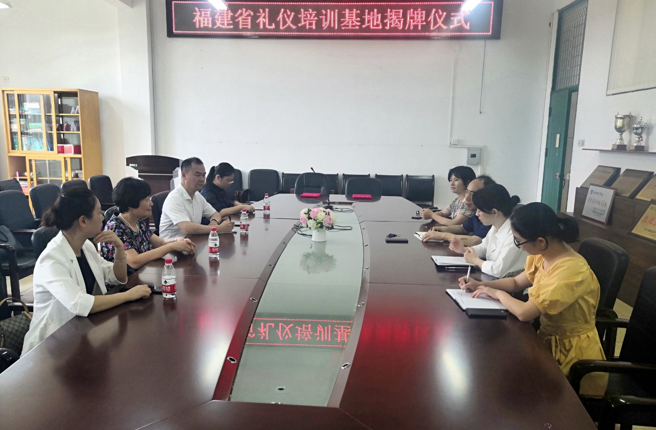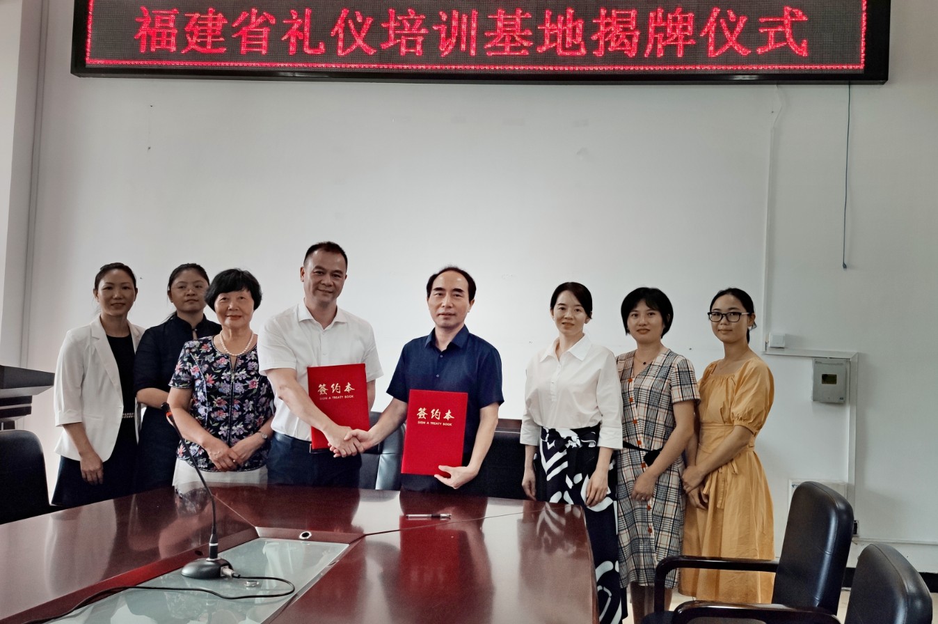 2019年6月21日上午,福建省礼仪协会会长蔡妮娜女士、秘书长黄利天先生、副秘书长廖晓燕女士及协会办公室主任谢芬女士等一行人,来到公司举行“福建省礼仪培训基地”揭牌和签约仪式。公司党委书记郑立文教授、学工处王中妍老师、酒店管理系主任詹岚老师和林金梅老师等参加仪式。